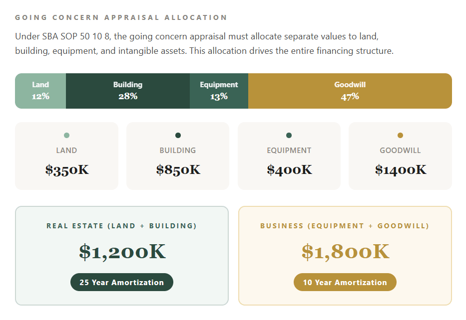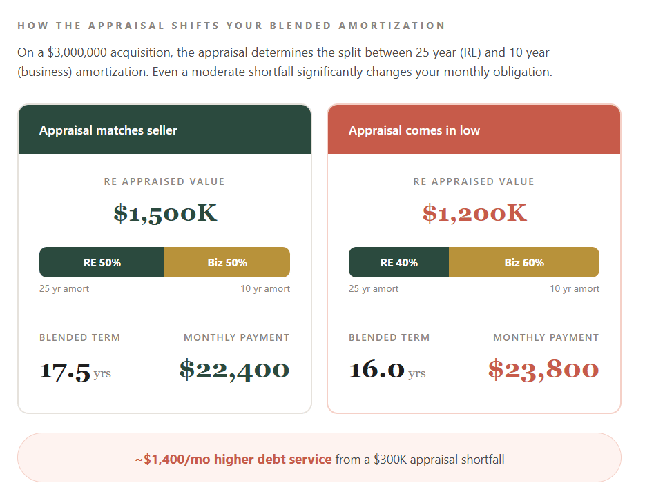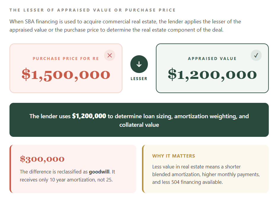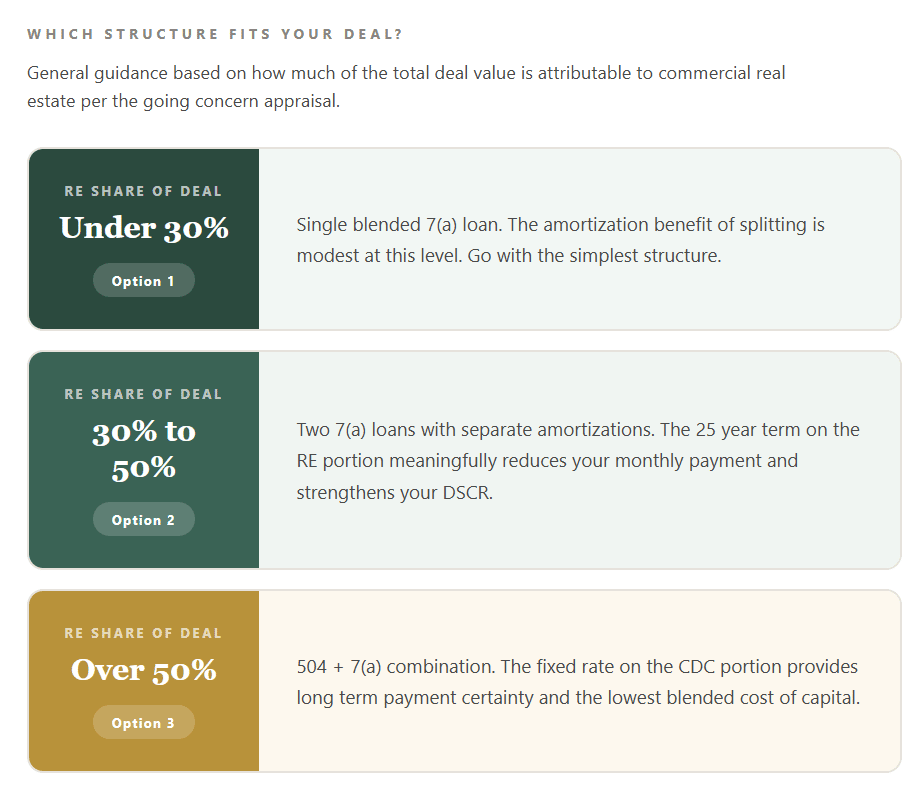 That gap has to come from somewhere: additional buyer equity, a larger 7(a) loan for the business portion, or renegotiation of the purchase price. Now layer on the equity adjustment. If the buyer is a startup and the equity requirement is 15% instead of 10%, the numbers shift further: the CDC portion drops to 35% of the eligible project cost, meaning the buyer needs even more capital at close. On a $1,600,000 eligible project cost, that's $560,000 from the bank (50%), $560,000 from the CDC (35%), and $240,000 in buyer equity (15%) — plus the $400,000 gap from the appraisal shortfall. The total buyer exposure in that scenario is $640,000 instead of $200,000 under the best-case structure. This is why the appraisal can make or break a 504 deal. A strong appraisal keeps the full 504 financing structure intact and minimizes the cash the buyer needs at closing. A weak appraisal can create a six-figure gap that fundamentally changes the economics of the transaction. The Going Concern Appraisal: What Buyers Need to UnderstandThere's one more piece to this that I want to flag, because it catches a lot of first-time buyers off guard. When you're acquiring a business that includes commercial real estate, the SBA requires what's called a going concern appraisal. This is performed by a state-certified general real property appraiser, and it's different from a standard real estate appraisal in an important way: it must allocate separate values to each component of the transaction. That means the appraiser breaks the total value into land, building, equipment, and intangible assets (goodwill). The real estate allocation from this going concern appraisal is what the lender uses to apply the lesser-of rule, determine whether the 51% threshold is met, calculate the amortization split, and size the 504 loan if applicable. If the appraiser assigns a high value to the real estate and a lower value to goodwill, you benefit: longer blended amortization (or potentially the full 25-year term if you cross 51%), more 504 financing available, and lower monthly payments. If the allocation tilts the other way, you're looking at shorter loan terms and higher debt service. This allocation is not something you control, but it is something you should understand going into the process. Knowing what the building is likely to appraise for relative to the total deal price should inform your deal structure from day one. How to Think About Which Option Is Right for Your DealThere's no single best structure. The right answer depends on the specifics of your deal: the appraised value of the real estate, whether the deal crosses the 51% threshold, the total purchase price, your available liquidity, how much cash flow the business generates, and your lender's preferences. That said, here are a few general principles I've seen hold true across hundreds of deals. If the real estate represents 51% or more of the total purchase price and appraises at or near the allocated value, a single SBA 7(a) loan (Option 1) can be exceptionally attractive. You get the simplicity of one loan with a full 25-year term. No blending, no splitting, no CDC involvement. This is the cleanest path when real estate is the dominant asset. If the real estate is a meaningful share of the deal (say 30% to 50%) but below the 51% threshold, splitting into two 7(a) loans (Option 2) or using the 504 program (Option 3) becomes much more attractive. The longer amortization on the real estate component meaningfully reduces your monthly obligation and improves your DSCR, compared to a blended term on a single loan. If the real estate is a relatively small percentage of the total deal value (under 30%), the blended amortization benefit in Option 1 is modest, and a single 7(a) loan with a blended term may be the simplest path forward. The monthly payment difference between a 12-year blended term and a 10-year straight business term often isn't dramatic enough to justify more complex structuring. If the real estate is the dominant asset, appraises well, but you want rate certainty, the 504 program (Option 3) can offer the lowest blended cost of capital. The fixed rate on the 504 portion is particularly valuable in a rising or volatile rate environment. But you need to be comfortable with a longer, more complex closing process, the involvement of a CDC alongside your 7(a) lender, and potentially a higher equity injection than the headline 10% figure. The Practical TakeawayIf you're looking at a business that includes commercial real estate, the very first thing you should do, before you get deep into underwriting, before you start comparing lenders, is understand two numbers: what the real estate is likely to appraise for, and what percentage of the total deal value that represents. Those numbers drive everything. The appraised value, specifically the lesser of the appraised value or purchase price, determines your amortization in a blended 7(a) structure. It tells you whether you cross the 51% threshold that unlocks the full 25-year term. It determines how much 504 financing is available. It shapes your monthly payment, your equity requirement, and ultimately your total cost of ownership. Work with your lending broker to model all three scenarios before you commit to a structure. A good broker will know which lenders handle each of these structures smoothly and can help you avoid the common pitfalls: lenders who won't split into two 7(a) loans, CDCs with slow timelines that jeopardize your closing date, appraisals that come in low and blow up the sources and uses at the eleventh hour, or equity requirements that are higher than expected because of startup classification or special-purpose property designation. This is one of those areas where the right guidance early in the process can save you tens of thousands of dollars over the life of the loan. if you're working on an acquisition, or are in the pre-LOI phases, you can book a short, informal call here to meet our te