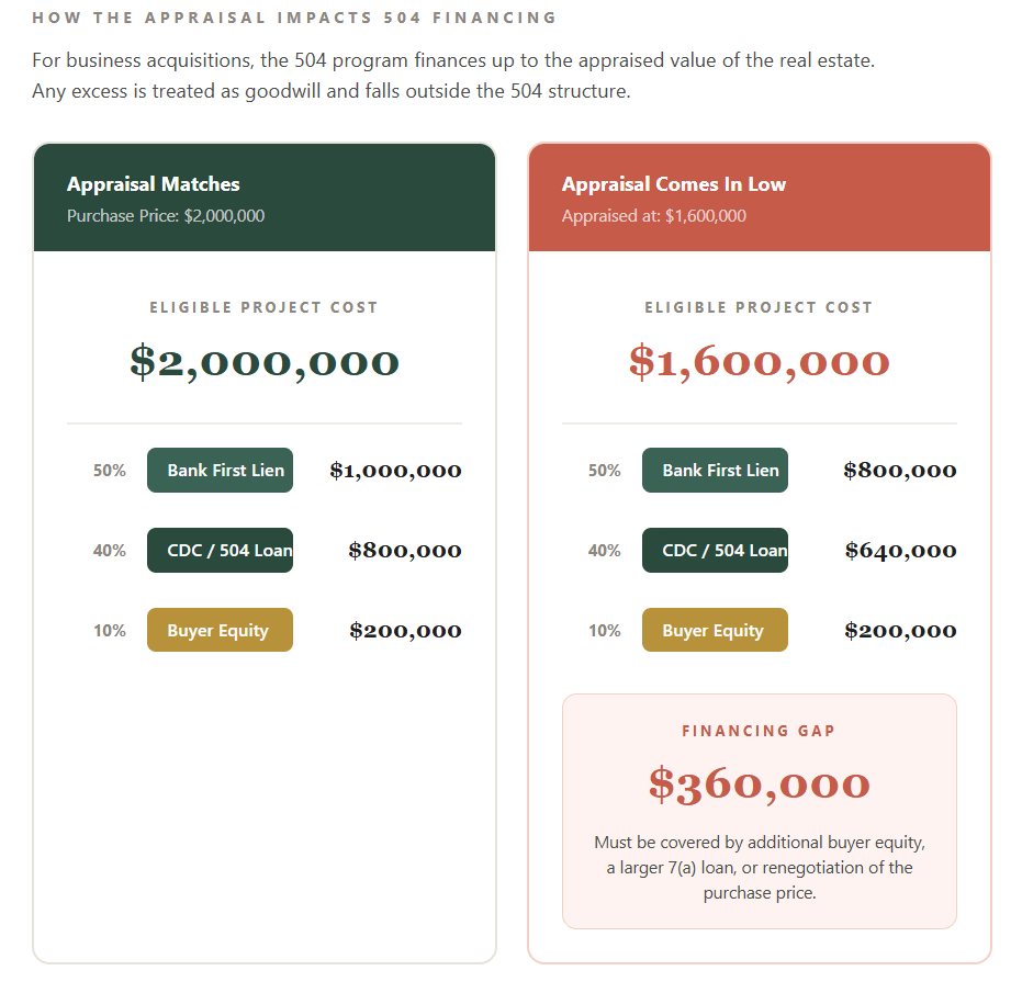 But if the appraisal comes in at $1,600,000, the eligible project cost for 504 purposes drops to $1,600,000: